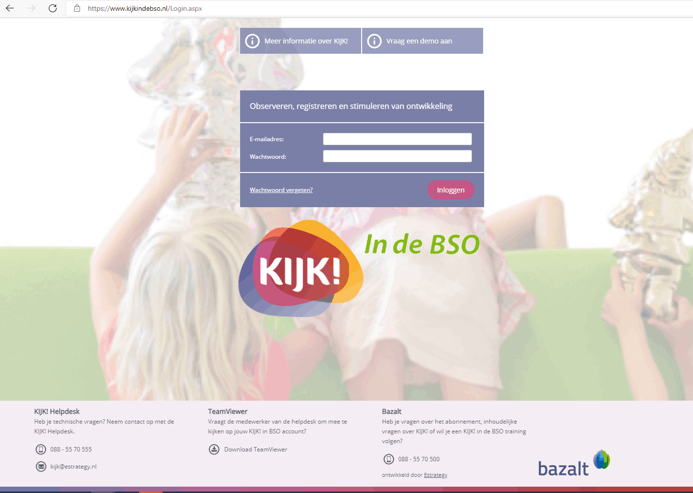 Je voert de registraties in in een webbased applicatie. Je kunt in KIJK! in de BSO de betrokkenheid van kinderen, hun welbevinden en aspecten van sociaal competent gedrag registreren. Dit kan vanaf thuis of elke andere plek met toegang tot internet. De gegevens worden goed beveiligd en zijn niet toegankelijk voor anderen.