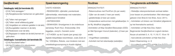 Bij de doelen die je voor het standaardaanbod selecteerde beschrijf je hoe die aan bod komen in de speelleer-omgeving, tijdens routines en tijdens terugkerende activiteiten. De inrichting die je beschrijft en de routines en activiteiten omvatten altijd veel meer doelen, die tegelijkertijd aan bod komen. Zie ook het (deel) voorbeeld. Kies dus niet bij ieder doel één activiteit of inrichting! Zo werkt het (gelukkig maar) niet in het spel van jonge kinderen. Alles ontwikkelt in samenhang.